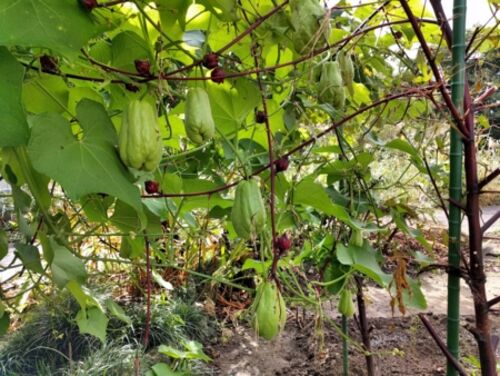 同郷の大先輩に薦められて、恐るおそる栽培を始めたハヤトウリですが、これが最盛期を迎え、いわゆる鈴なり状態になってしまった。ローゼルの残り株に絡まる蔓だけでも8個なっている。ひと雨ごとにぐんぐん成長しています。 洋ナシのような形の初々しい外観…